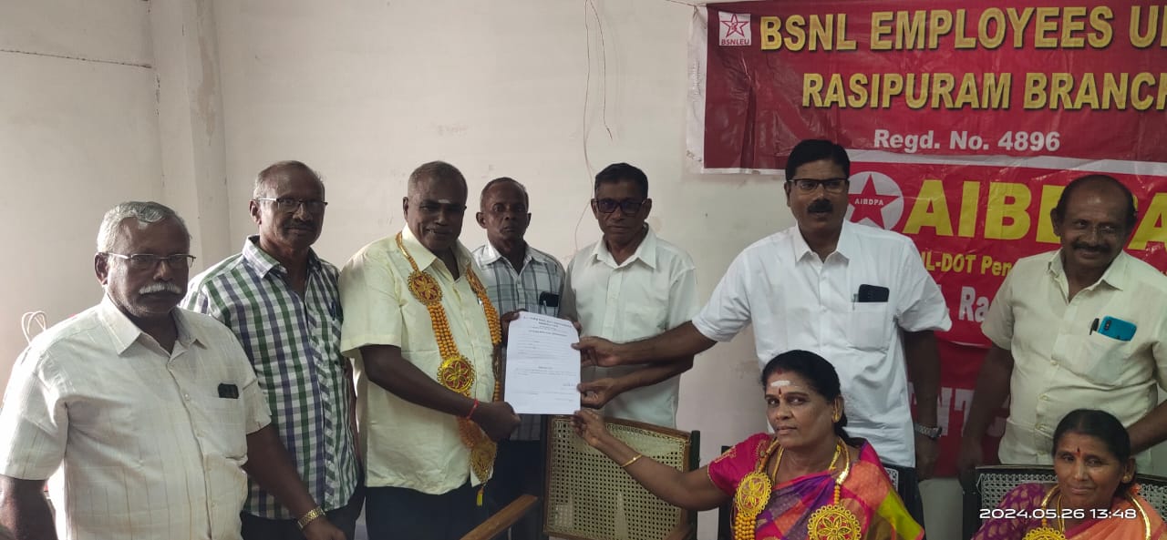 ராசிபுரம் கிளை செயலர் தோழர் S. கணேசன் மற்றும் ராசிபுரம் கிளையின் முன்னணி தோழர், தோழர் P. முத்துசாமி ஆகியோர், வருகிற 31.05.2024 அன்று இலாக்கா பணி நிறைவு செய்கின்றனர். 26.05.2024 அன்று ராசிபுரம் தொலைபேசி நிலையத்தில், இருவருக்கும் பணி நிறைவு பாராட்டு விழா வெகு சிறப்பாக நடைபெற்றது.